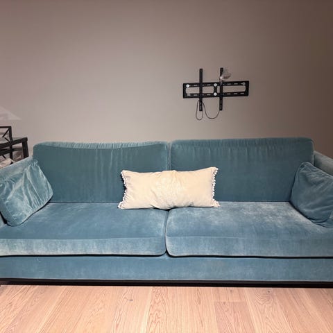 Skeidar sofa i blå velur. Sofaen har rette linjer med armlener i samme høyde som rygg, og løse rygg- og seteputer. Trekket er i myk velurlignende tekstil i mørk blå farge. Passer som sittemøbel i stue eller TV-rom. Designet er jeg selv litt usikker på med tanke på at jeg kjøpte sofaen på finn. Jeg selger denne fine og komfortable sofaen på grunn av flytting.
