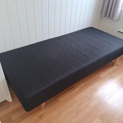 Møtrk grårammemadrass med bein og uten overnadrass.
