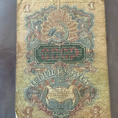 Russisk pengeseddel med pålydende verdi tre rubler. Seddelen har dekorativt motiv med russisk tekst på begge sider, serienummer trykt i rødt og detaljerte ornamenter i grønn- og bruntoner. Egner seg som samleobjekt eller til bruk i en seddelsamling.
