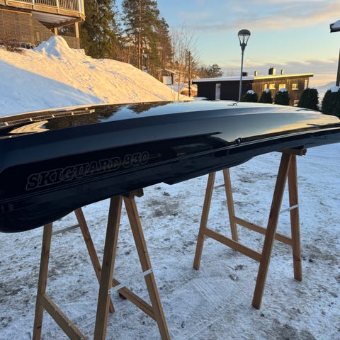Selger en Skiguard 850 takboks i svart farge. Dette er en aerodynamisk og solid modell som monteres på takrails. Boksen åpnes i bakkant og har god plass til ski og annet turutstyr.