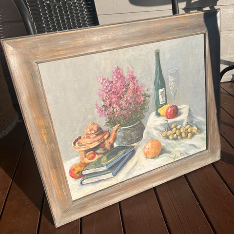 Maleri av type stilleben som viser en champagneflaske, to champagneglass og pioner i vase. Motivet er malt i lyse, duse fargetoner med synlige penselstrøk og tekstur i overflaten. Bildet har et klassisk stillebenuttrykk og passer som veggdekor i for eksempel stue, kjøkken eller spisestue.