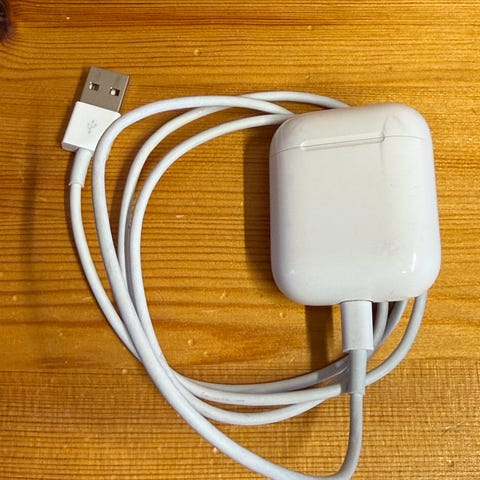 Selger pent brukte AirPods Gen 1 + en ladestasjon. Ladestasjonen kan lade en iPhone trådløs samtidig med AirPods på siden.