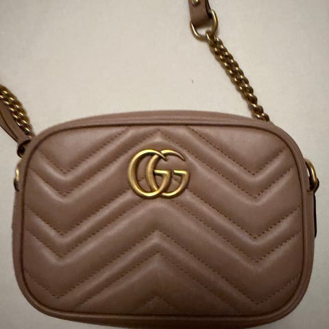 Gucci skulderveske for dame i lær. Vesken har kompakt rektangulær form med glidelåslukking og justerbar skulderrem. Fargen er lys rosa, og fronten har quiltet mønster og metallogo. Leveres med original dustbag og eske, egnet til hverdagsbruk eller tilbehør ved ulike anledninger.