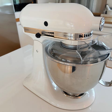 Selger KitchenAid kjøkkenmaskin i fargen pistasje, med tilbehør.