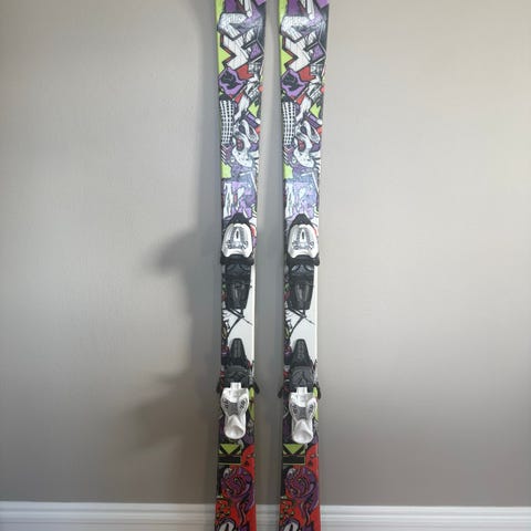 Twintip K2 alpinski med bindinger. 139 cm lange. Artige ski til slalåm og park. Lette og gode å manøvrere. Godt brukt, men fortsatt veldig gode ski.