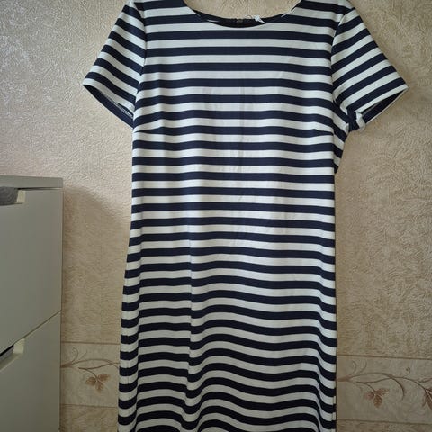 Fin kjole i behagelig bomull, hvit med mørke blå striper.