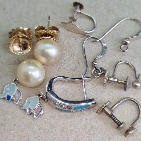 Selges: Lot med øredobber. De fleste single. Et par med skade/lyter. Studer bildene! Vekt: ca 6,6 gram. Antatt sølv. Bortsett fra noen stoppere med sølvstempel, er metallet ikke stemplet. Vi tror det er sølv, men kan ikke si noe sikkert da vi ikke er eksperter. Det ser for oss ut som sølv og med hjemmesølvtestekit har vi testet det og fått som resultat at det er sølv. Men: Vi garanterer ingenting, da vi ikke er eksperter!
