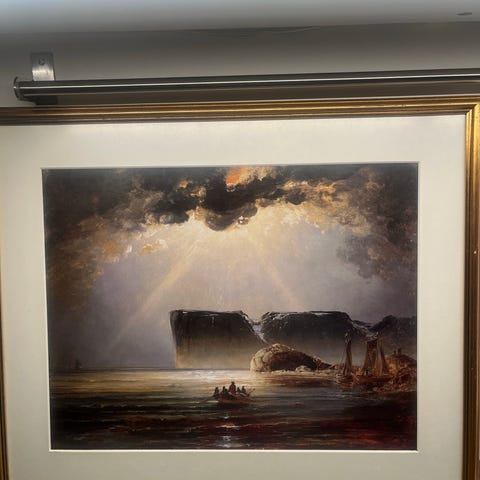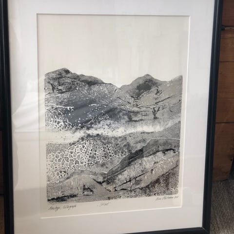 fotografisk landskapsmotiv av isle of Mann fjellformasjon og dal, montert i ramme med passepartout. Bildet viser et naturlandskap med grønne åser og fjell i bakgrunnen. Passer som veggdekor i stue, gang, kontor eller andre oppholdsrom.