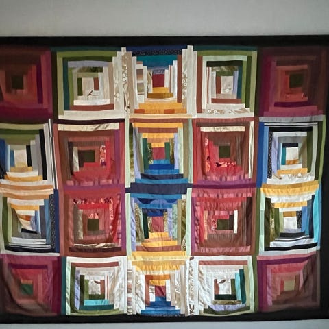 Veggteppe i quilteteknikk med stjernemønster i sterke, flerfargede stoffbiter på svart bakgrunn. Teppet har løkker øverst for oppheng på stang eller list. Kantene er rammet inn med en smal, kontrastfarget avslutning. Passer som veggdekor i stue, gang, soverom eller hobbyrom, og kan også brukes som lite sengeteppe eller dekorativt teppe over stol eller sofa.