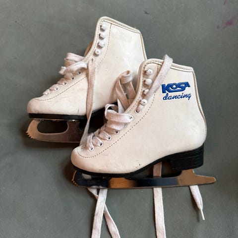 Kosa Dancing skøyter i størrelse 34. Klassiske hvite skøyter med snøring og hæl, egnet til generell skøytebruk på isbaner. Overdel i syntetisk materiale med ankelstøtte og stålskinne under.
