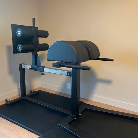 Nohrd treningsbenk i tre med polstrede svarte puter i god kvalitet. Benken har justerbar konstruksjon med bevegelig liggeflate og fotstøtte med rullepute. Egnet for ulike styrkeøvelser, blant annet nordic hamstring og kjernetrening. Stabil ramme i tre gir fast underlag ved bruk på treningsrom eller hjemme.