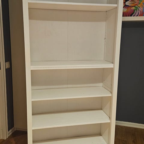 Hvit bokhylle med en fast og flere justerbare hyller. Hyllene gir plass til bøker, permer eller dekor. Overflaten er glatt og lys, og passer inn i de fleste rom som stue, soverom eller kontor. Nederst på hyllen er det noe slitasje på kanten, ellers fremstår hyllen som funksjonell. Materialet er malt tre/trebasert plateverk.