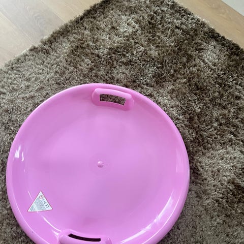 Bluey akebrett i rund modell. Akebrettet er laget i plast og har to håndtak. Farge rosa. Egnet for bruk i snøbakker for barn som ønsker et enkelt og lett akebrett.