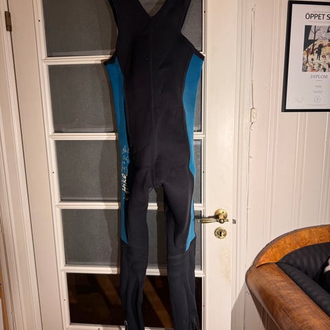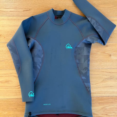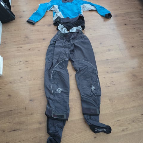 Palm padlebukse med høy midje. Buksen er i grått med blå overdel og justerbar midje med borrelås. Integrerte sokker i samme materiale som buksen. Egnet som ytterlag ved padling og andre vannaktiviteter der man ønsker beskyttelse mot sprut og vanninntrenging i livet.