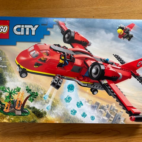 LEGO City brannfly byggesett med rødt fly, skog-/treseksjon og brannutstyr. Settet inkluderer flere minifigurer med brannmannsutstyr, tilbehør til slukking av brann og trykte byggeinstruksjoner som vist på bildene.