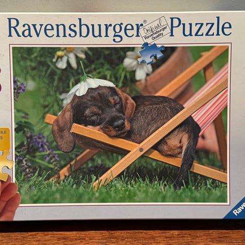 Ravensburger puslespill med motiv av katt som ligger i en kurv med rutete teppe og blomster i bakgrunnen. Puslespillet består av brikker i papp med trykket motiv i farger. Egnet som aktivitet for barn og voksne som liker dyremotiv og puslespill.