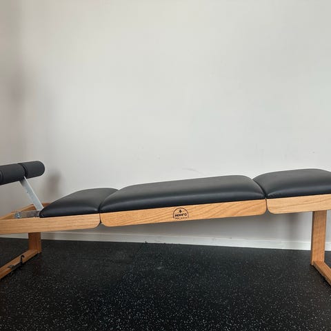 Nohrd treningsstativ med sandsekker i tre og svart materiale. Stativet har vertikal konstruksjon med flere horisontale trestenger hvor sandsekkene henger. Egnet for oppbevaring og organisering av treningsutstyr i treningsrom, studio eller hjemmegym. Sandsekkene kan brukes til ulike styrke- og balanseøvelser, og stativet gir enkel tilgang til utstyret under trening.