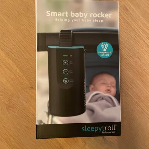 Sleepytroll Smart Baby Rocker er en enhet for vuggebevegelse til barnevogn. Produktet festes til vognen med en justerbar stropp og gir automatisk vugging. Enheten har flere knapper for styring av funksjoner, blant annet av/på og ulike innstillinger for bevegelse. Farge er svart med turkise detaljer. Egnet for bruk på barnevogner for spedbarn og små barn der man ønsker jevn vuggebevegelse uten å trille vognen manuelt.