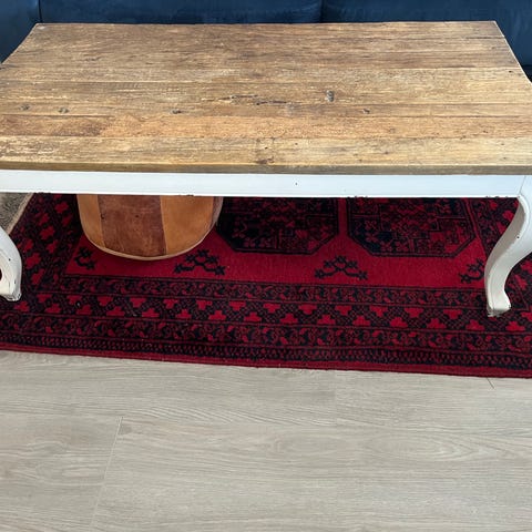 Bordet har normal bruksslitasje på bordplaten (se bilde), blant annet noen overfladiske merker, men fremstår ellers som pent og godt vedlikeholdt. Ingen løse deler – står støtt og stabilt.