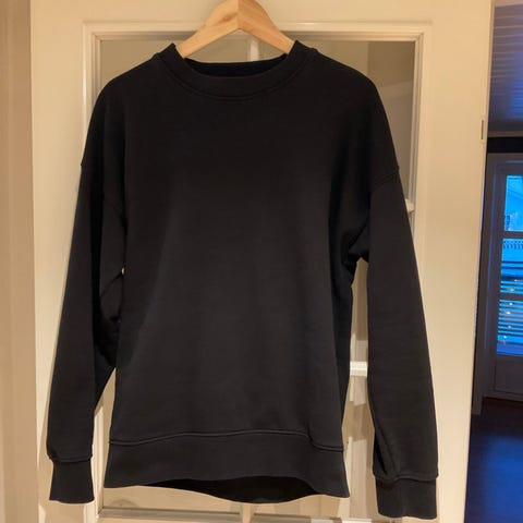 H&M genser for herre i størrelse S. Genseren er rød og laget av bomull. Den har lange ermer og enkel, klassisk utforming som passer til hverdagsbruk eller som et ekstra lag over t-skjorte eller skjorte.