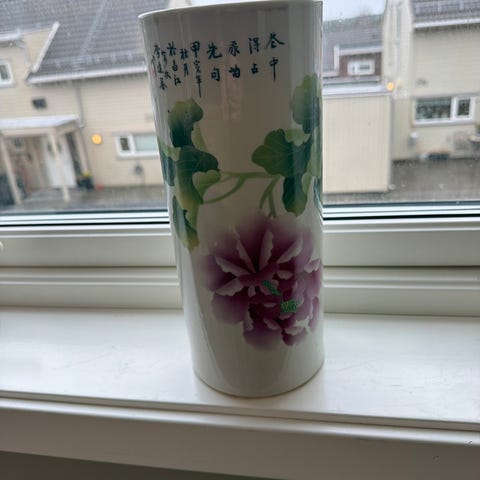 Kinesisk Keramikk fat med grønn glasur og mørk kant. Fatet har tre lyse, dekorative mus langs kanten. Undersiden er glasert i lys, prikket tone med innpreget stempel/signatur. Egner seg som dekorasjonsfat eller serveringsfat på bord eller hylle.dia ca 14,5cm....Orginal gjenstand