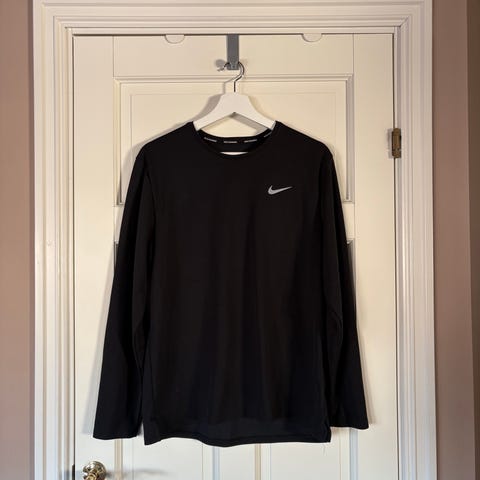 Nike løpetrøye for herre i størrelse XL. T-skjorte med kort erm, laget i lett og pustende mesh-materiale egnet for løping. Farge grønn med Nike-logo på brystet. Passer til løping og annen trening utendørs og innendørs.
