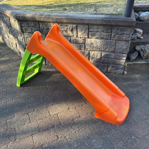 Plast sklie til barn i gul og rød farge. Sklien har trapp med håndtak og rekkverk øverst for enklere oppstigning og støtte. Egnet som innendørs eller utendørs lekeutstyr for mindre barn, avhengig av plass og underlag. Laget i plast som er lett å rengjøre og flytte på.