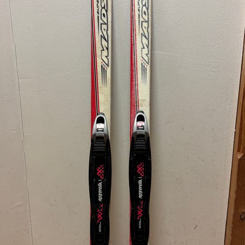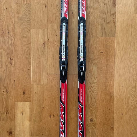 Madshus Redline langrennski med integrerte bindinger. Skiene har overflate i hvit og rød med svart såle. Passer til klassisk langrennstrening eller turbruk. Nesten ikke brukt.