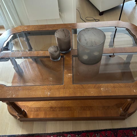 Glassbord med bøker ( ikke lesbare) som hører til og er montert i bordet
