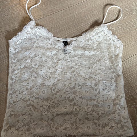 DAY Birger et Mikkelsen singlet for dame i størrelse S. Topp i krem farge. Modellen har smale stropper og blondedetaljer foran, med glatt stoff på baksiden. Egner seg som topp alene eller som underlag under andre plagg.