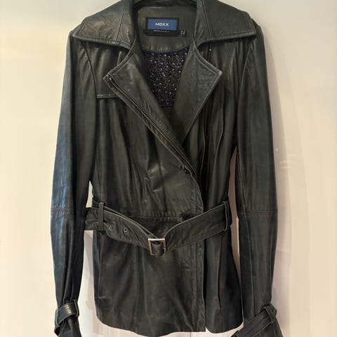 Mexx skinnjakke for dame i brun farge, størrelse S. Jakken har glatt overflate, ståkrage og glidelåslukking foran. To store frontlommer med klaff og elastisk kant nederst på jakken og ved ermene. Yttermateriale i skinn, med glatt fôr på innsiden for bedre komfort. Passer som lett ytterjakke i overgangssesonger.