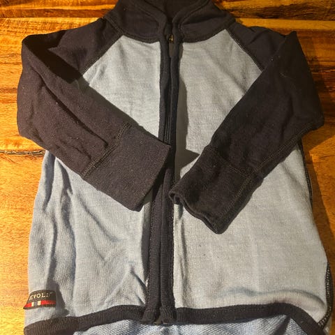 Polarn O. Pyret ullgenser størrelse 86. Fargekombinasjon med blå front og rygg samt mørke ermer og detaljer. Hel glidelås i front og høy krage. Egnet som mellomlag eller ytterlag avhengig av vær og temperatur.