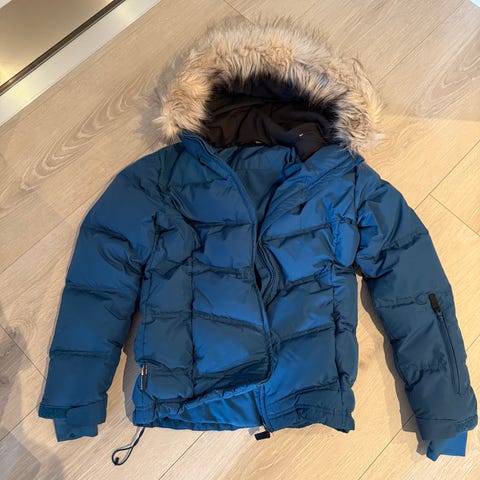 Stormberg dunjakke for barn i størrelse 164, unisex. Jakken er blå og fylt med dun, noe som gir god isolasjon. Den har hette med avtagbar fuskepels og glidelås i front. Innvendig er det navnelapp og merking med Re:Down, som indikerer resirkulert dunfyll. Passer som ytterjakke i kaldere vær for både jenter og gutter.