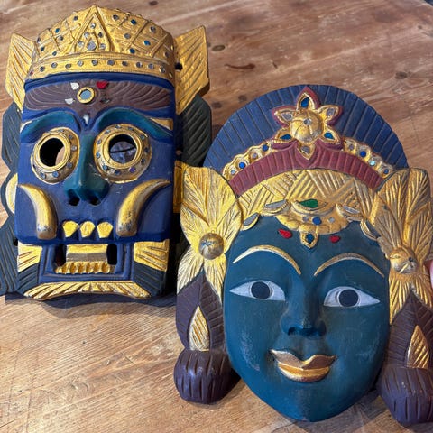HAY-dyremasker dekorasjon flerfarget. Sett med fem masker formet som ulike dyr, blant annet katt, fugl og andre dyrefigurer. Maskene har sterke, flerfargede motiv og er egnet som veggdekorasjon eller rekvisitter. Materialet fremstår som malt, hardt materiale. Maskene har festepunkter på baksiden for oppheng eller bruk.