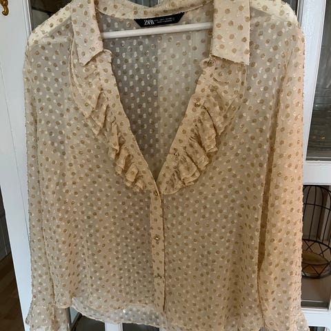 Zara skjorte for dame i størrelse M. Skjorten er beige med prikkete mønster og er laget i bomull. Modellen har klassisk krage, knappelukking foran og lange ermer med mansjetter og knapper. Passer til hverdagsbruk eller mer formelle anledninger, og kan brukes alene eller lag-på-lag over topp eller singlet. Selger derfor jeg brukte den kun en gang og ønsker å rydde skapet