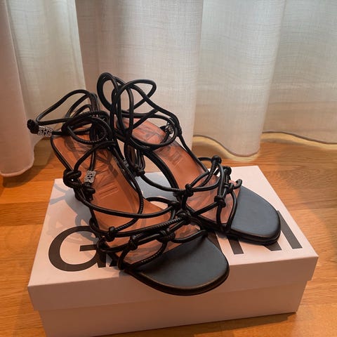 Ganni hæler i størrelse 40. Skoene er ankelhøye med spiss tå og lav hæl. De er laget i svart lakkmateriale med glanset overflate og har remmer med metallspenner over vristen og rundt ankelen. Innside i lyst materiale som gir kontrast til utsiden. Passer som damesko til bruk både til hverdags og mer formelle anledninger.