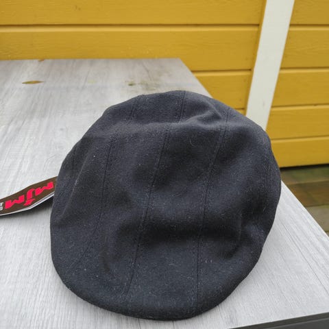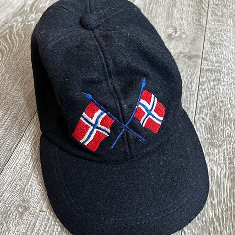 Caps som er norskprodusert i ull og skinn. Kvalitetsmerke Oppland luefabrikk. Svært lite og pent brukt. Størrelse 59.