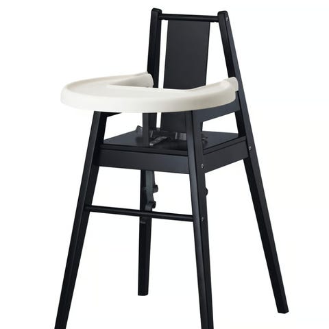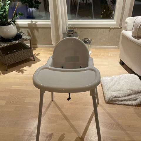 IKEA høy barnestol i hvit plast med metallben. Stolen har ryggstøtte, avtagbart bord og sikkerhetssele. Egnet som spiseplass for små barn ved bordet. Enkel, lett konstruksjon som er lett å flytte og rengjøre.