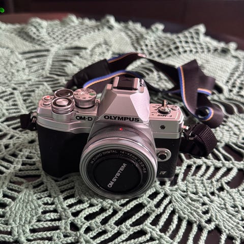 Olympus OM-D E-M10 i sølvfarge. Kjøpt nytt juni 2024. Knapt brukt.