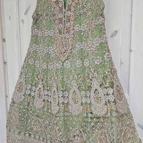 Kjole for jente i størrelse 134 i rosa farge. Kjolen har lange ermer og er dekorert med omfattende sølvfarget broderi og perledetaljer foran og nederst på skjørtet. Passer til bruk ved høytid, fest eller andre anledninger der man ønsker en mer pyntet kjole.