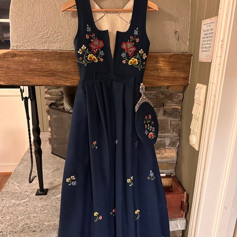 Selger en blå festdrakt til barn med nydelig blomsterbroderi og matchende veske/lue.
