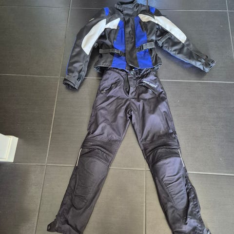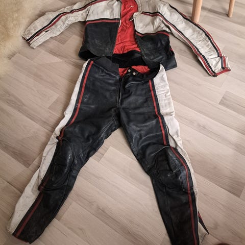 2 delt skinndress. (kan kobles sammen m glidelås) Jakke str 56. Bukse str 52.
