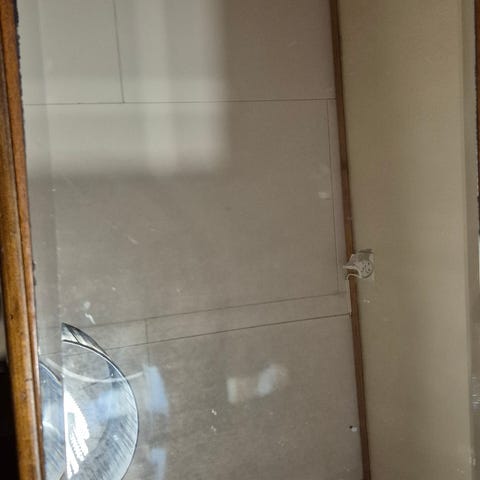 Gir bort et organisk speil med brist i glasset. Speilet er et tungt kvalitets speil med avrundet tykt glass l. Måler 60x70 cm.