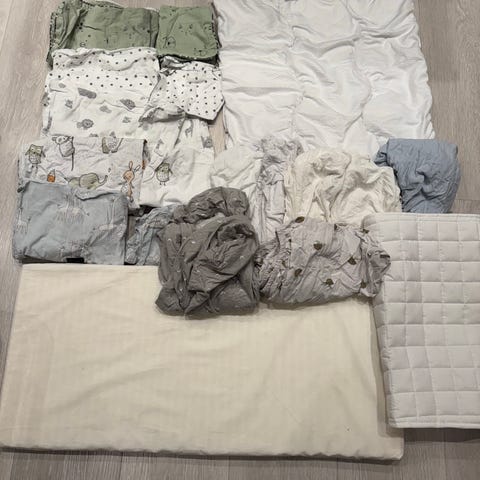 Selger en komplett og veldig fin startpakke til baby – passer fra nyfødt og perfekt til vogn, vugge eller bedside crib.
