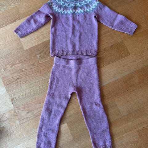 Hjemmestrikket sett i friske farger. I myk og god ull. Brukt av ett barn. I god hjemmestrikket stand, brukt av ett barn 😊