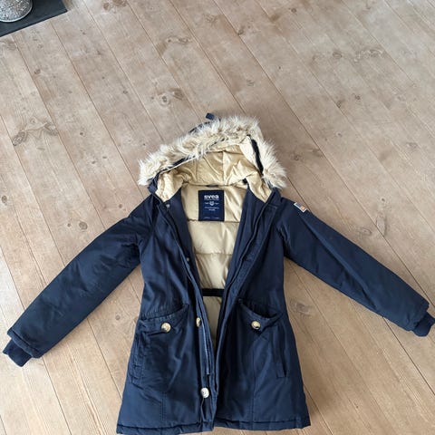 Svea vinterjakke for dame i størrelse XS. Jakken er svart og laget i polyester. Den har hette med avtagbar fuskepelskant (basert på bildet), glidelås og knappelukking i front, samt lommer i siden. Jakken har brodert Svea-logo og merke på ermet. Passer som varm ytterjakke i den kalde årstiden.