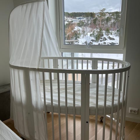 Stokke Sleepi mini v3 + madrass + madrassbeskytter + sengekant selges billig.