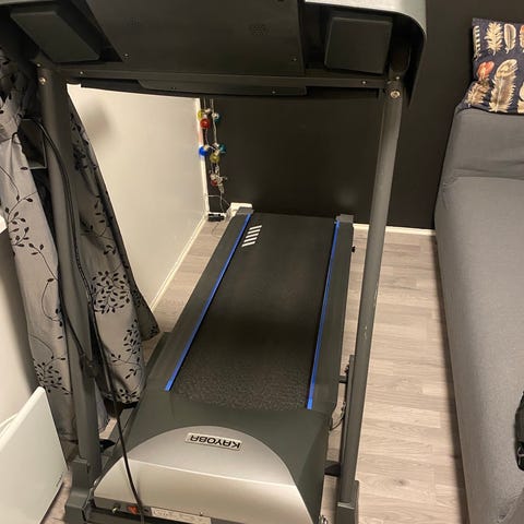 Sammenleggbar elektrisk tredemølle i grå utførelse. Tredemøllen har konsoll med display for visning av treningsdata og betjeningsknapper for hastighet og programmer. Modellen har to koppholdere ved konsollen og sikkerhetsknapp foran. Løpeflaten er rett og maskinen kan felles opp for plassbesparende oppbevaring når den ikke er i bruk. Egnet til innendørs kondisjonstrening.