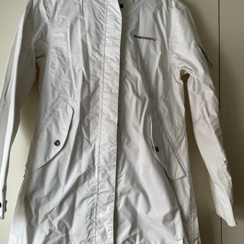 Didriksons regnjakke for dame i størrelse 38. Jakken er hvit og laget i polyester. Modellen er knelang med hette og glidelås med knappestolpe foran. Justering ved ermer og midje gir bedre passform. Egnet som regntøy i vått og vindfullt vær.