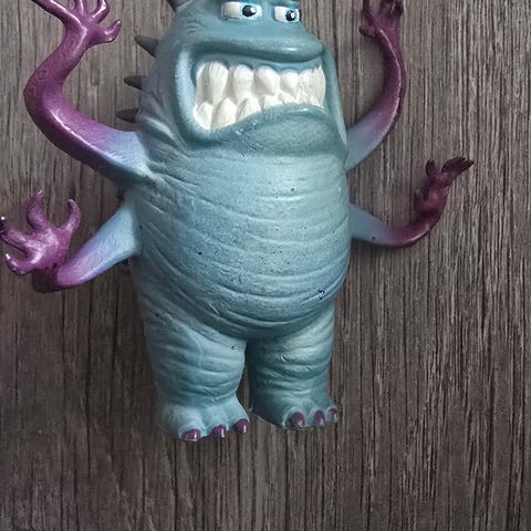 Liten plastfigur formet som et monster i grå og lilla farger, med blå base. Figuren har markerte detaljer som pigger på hodet og ryggen, store øyne og klør på føttene. Egnet som leke, samlefigur eller pynt på barnerom. Størrelse er liten og passer i hånden til et barn.Figuren er en lekefigur av karakteren Thaddeus "Phlegm" Bile fra Disney/Pixar-filmen Monsterbedriften (Monsters, Inc.).
